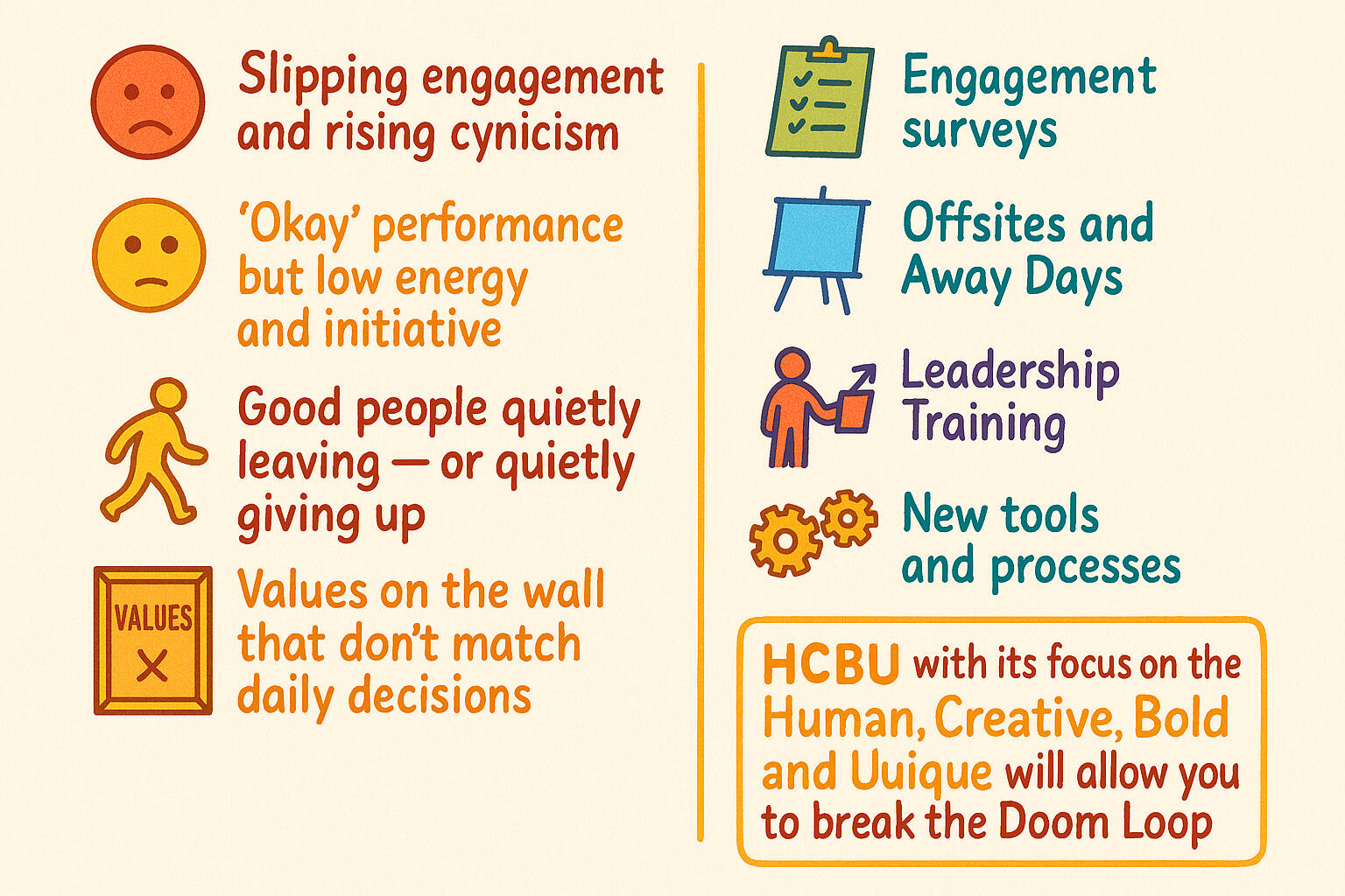 You may have tried:- Engagement surveys- Offsites and away days- Leadership training- New tools or processesMay include:- Slipping engagement and rising cynicism- “Okay” performance but low energy and initiative- Good people quietly leaving – or quietly giving up- Values that don’t match daily decisions